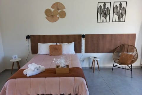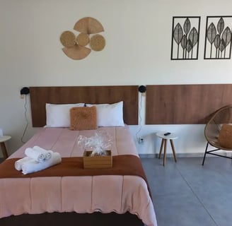 As suítes tem 30 m2 com cama box de casal, roupa de cama e banho 100% algodão, TV 32", ventilador de teto, frigobar, micro-ondas e cafeteira.