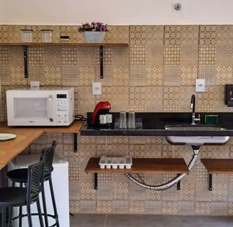 Disponibilizamos kit de café da manhã incluso na diária. Este kit é composto de torradas, geleias, café, leite em pó, chá, queijo Polenguinho, suco de laranja, damasco, ameixa e minibrownie.